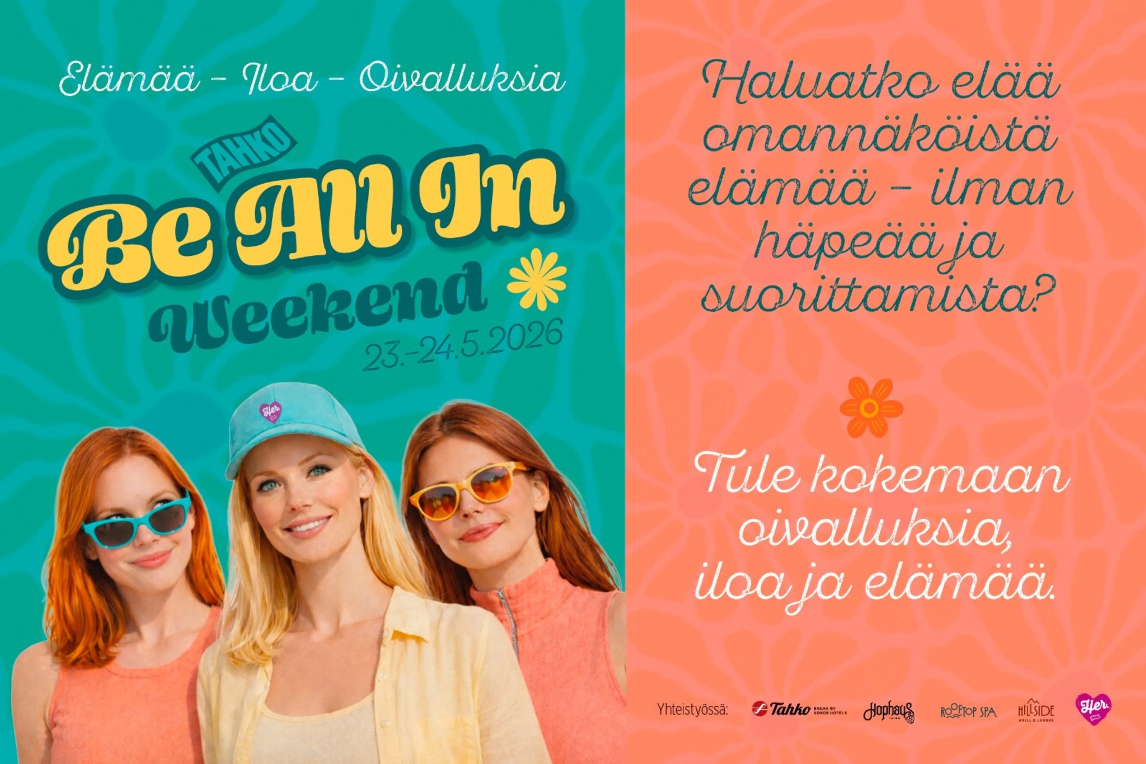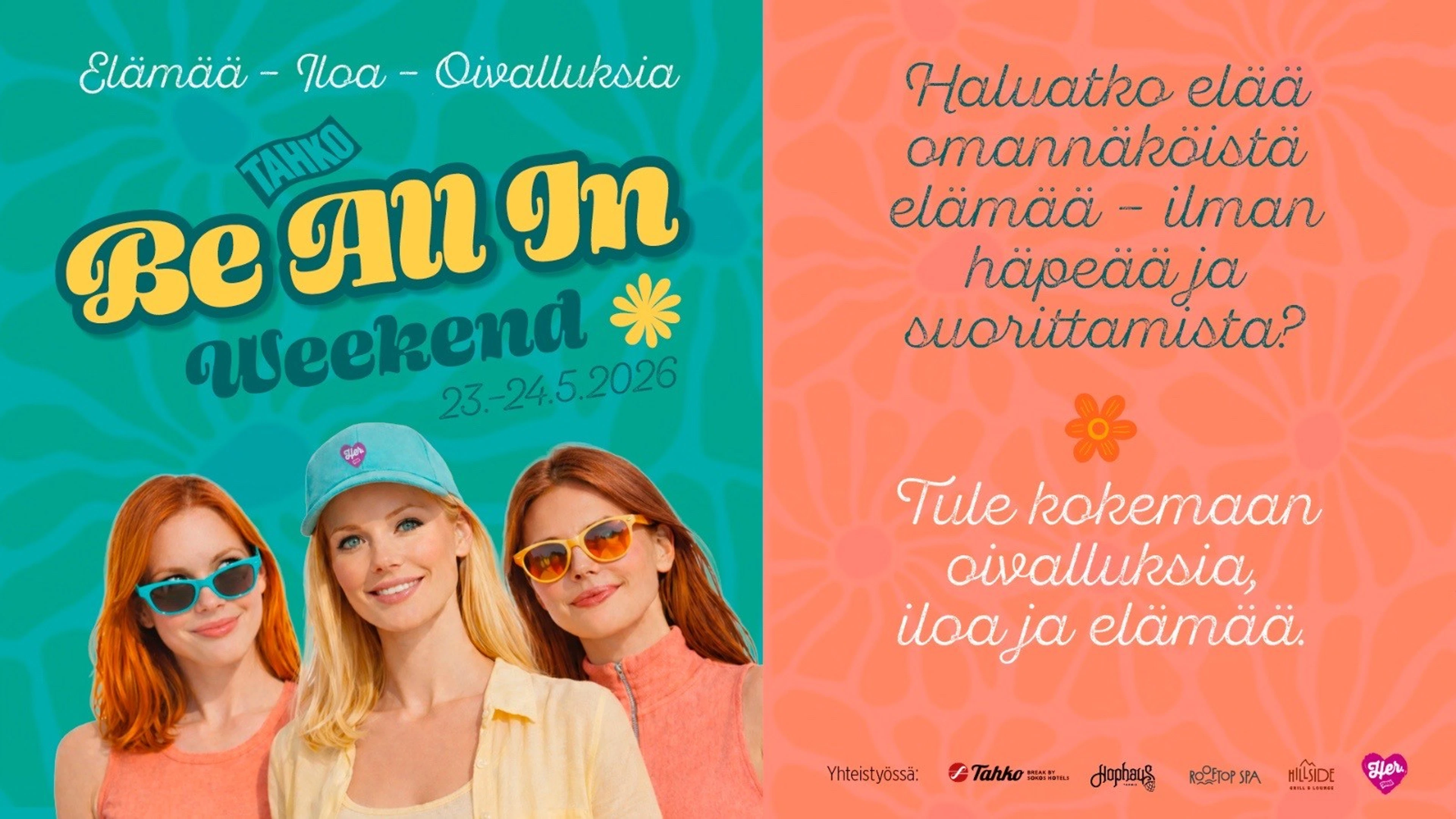 Tahko, 23.–24.5.2026 – Tahkolla järjestetään toukokuussa uudenlainen hyvinvointi- ja elämysviikonloppu, Be All In – Weekend, joka yhdistää inspiroivat puheenvuorot, merkitykselliset kohtaamiset, laadukkaat elämykset ja Tahkon ainutlaatuisen tunnelman. Tapahtuma on suunnattu naisille, jotka haluavat pysähtyä hetkeksi arjen keskellä ja palata kotiin kirkkaamman, vahvemman ja innostuneemman olon kanssa.
